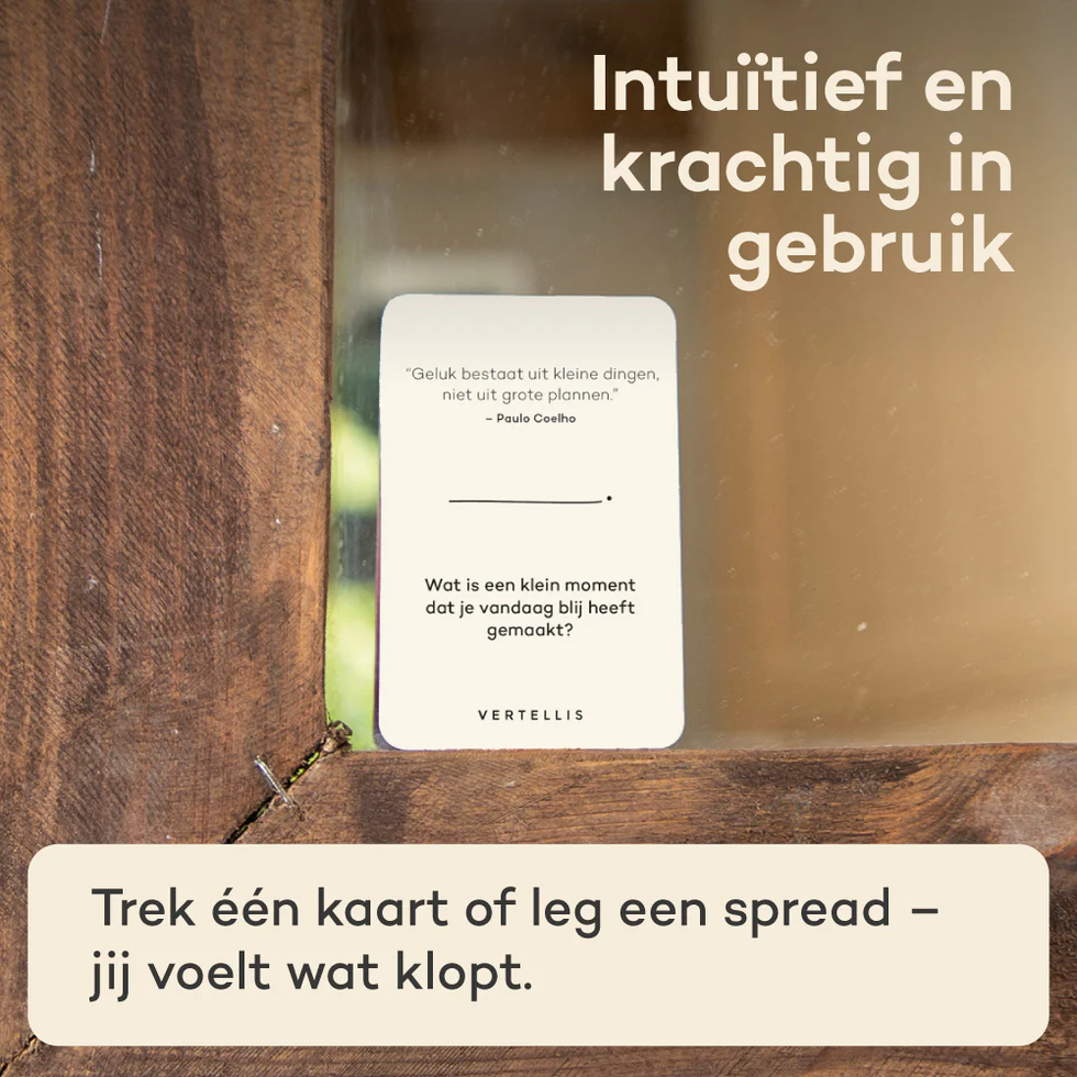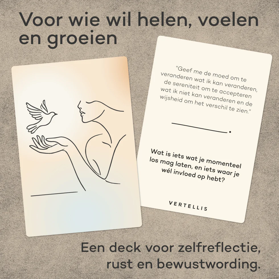 Met krachtige vragen, inspirerende citaten en poëtische teksten biedt het deck diepgang zonder zweverigheid. Het nodigt je uit om stil te staan, te voelen en eerlijk naar jezelf te kijken – zonder oordeel.
